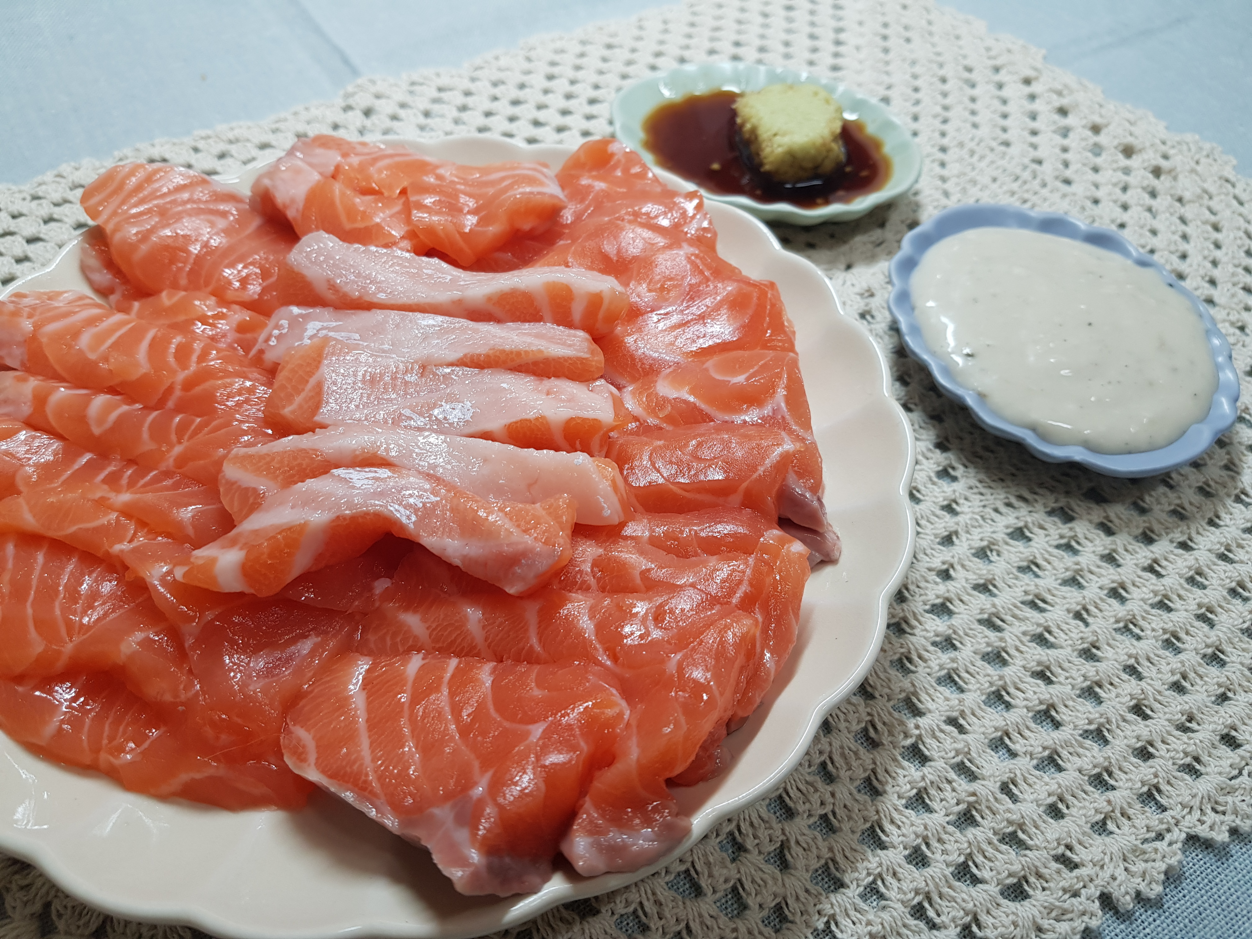 개인적으로 먹어보니 생연어 1kg에 양파소스 하나, 생와사비+간장 한 통 있으면 충분히 잘 즐길 수 있음!