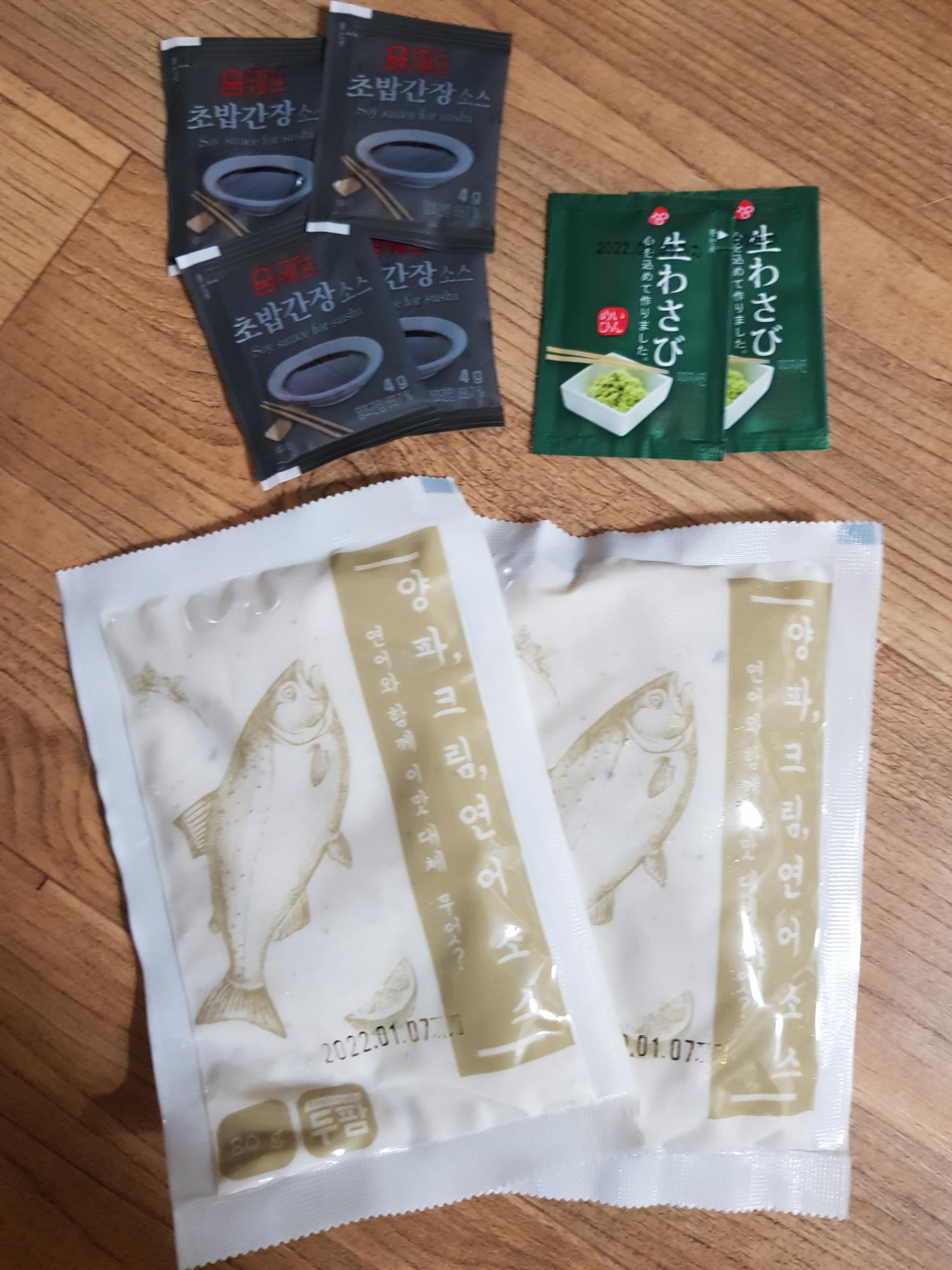 작게 포장된 간장과 와사비는 서비스로 주는 것이고