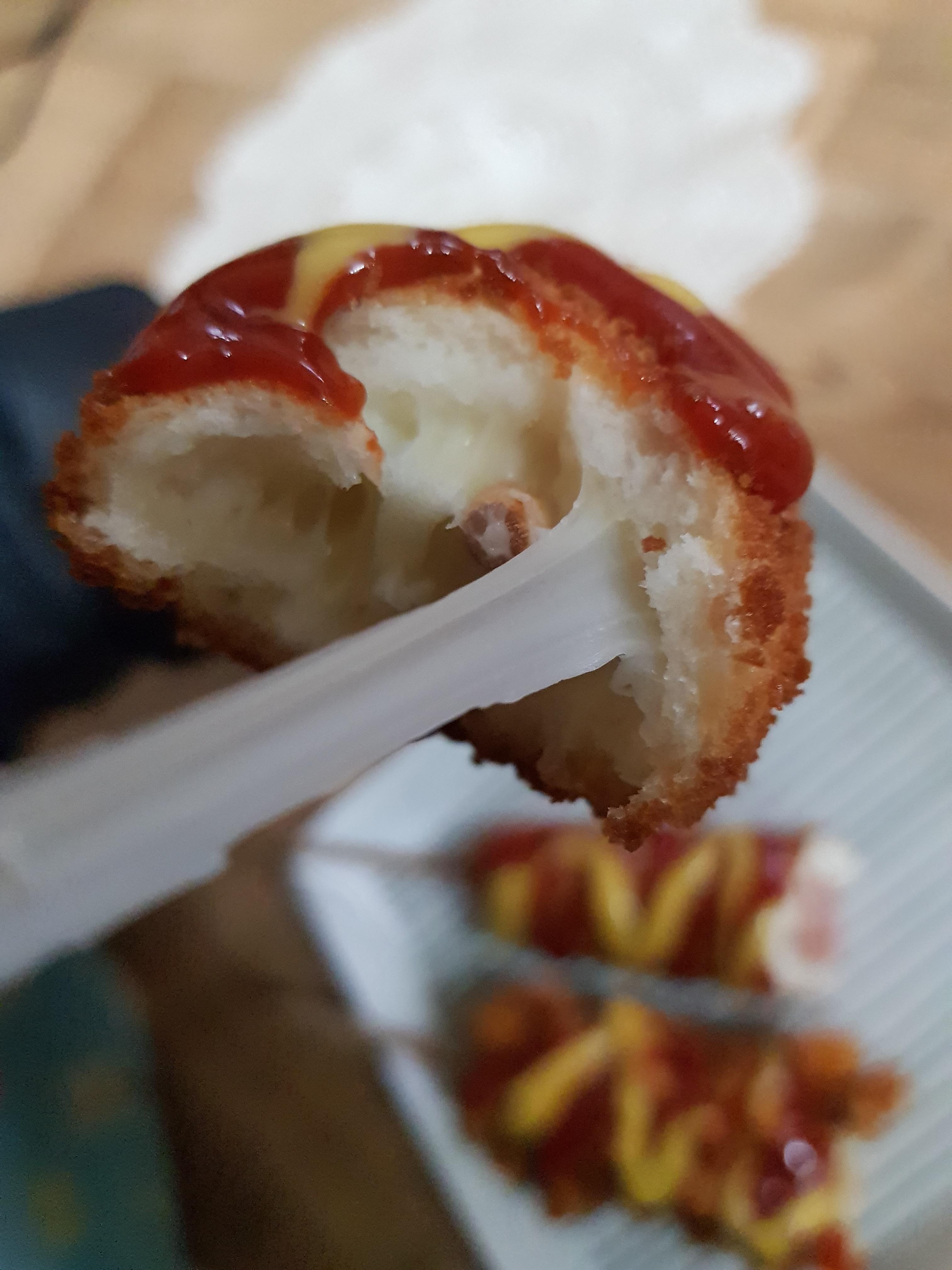 바삭해서 식감 좋고, 치즈 쭉쭉 늘어나고, 소시지는 그저 그런 핫도그.