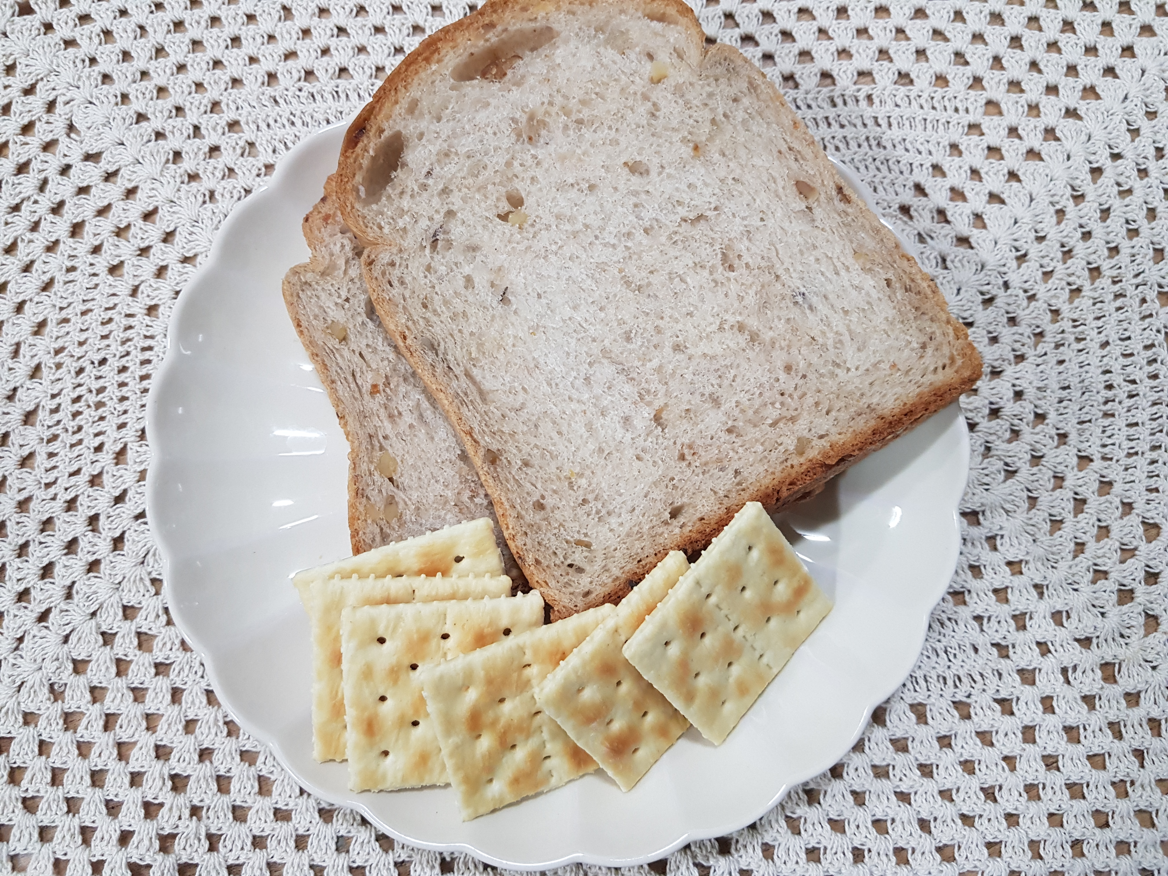 잠시 식히는 동안 사온 식빵과 크래커를 접시에 담았다