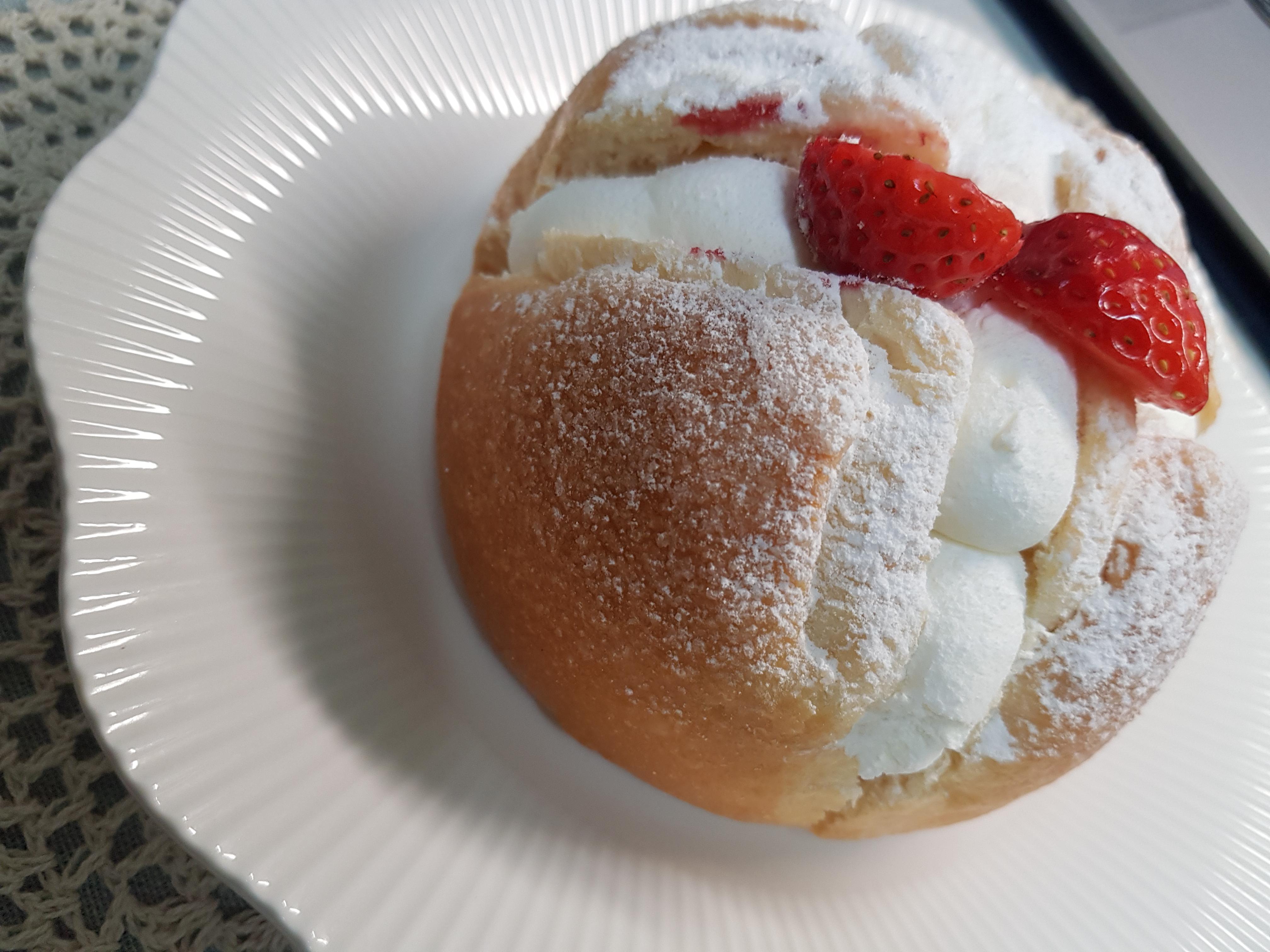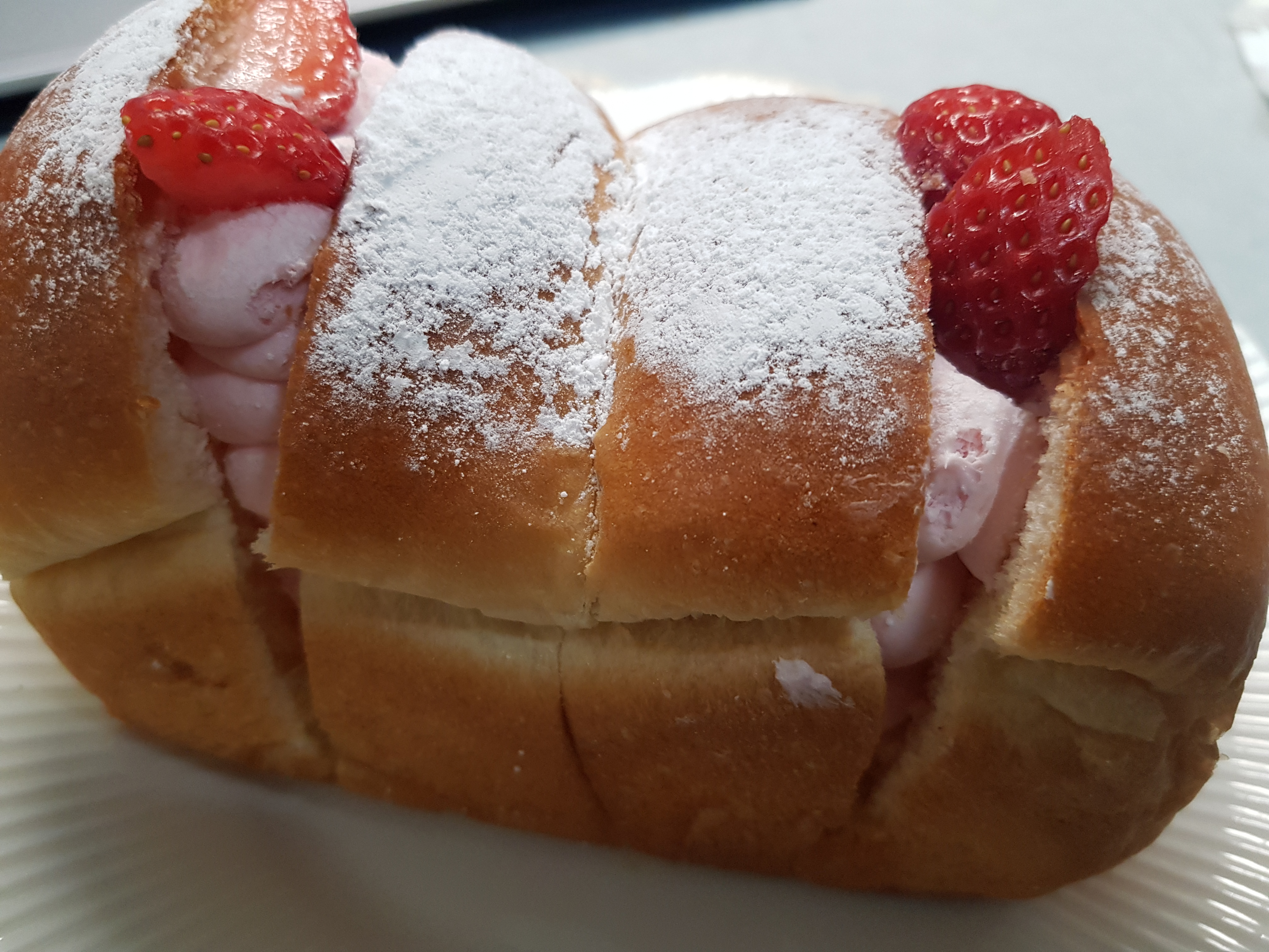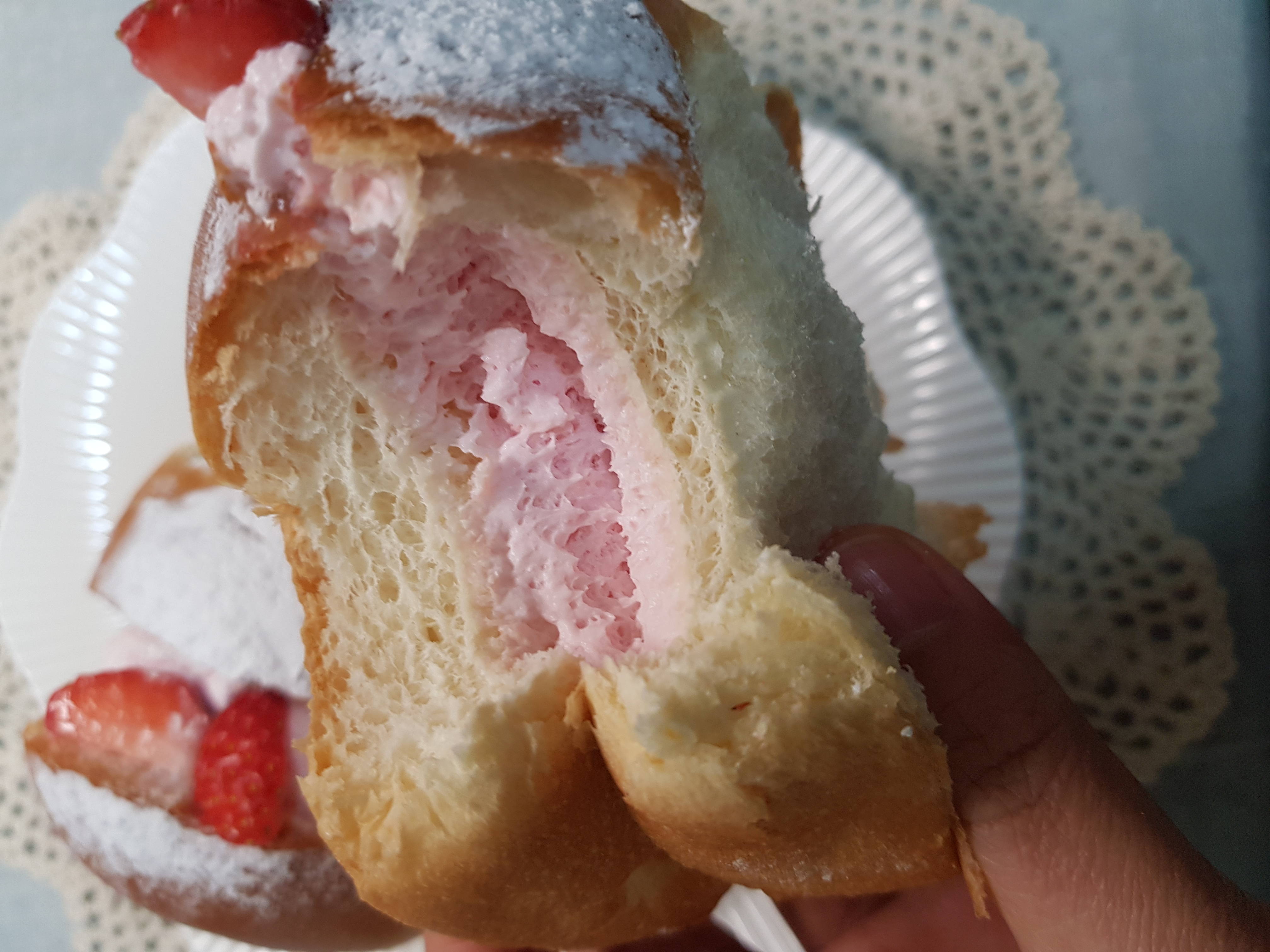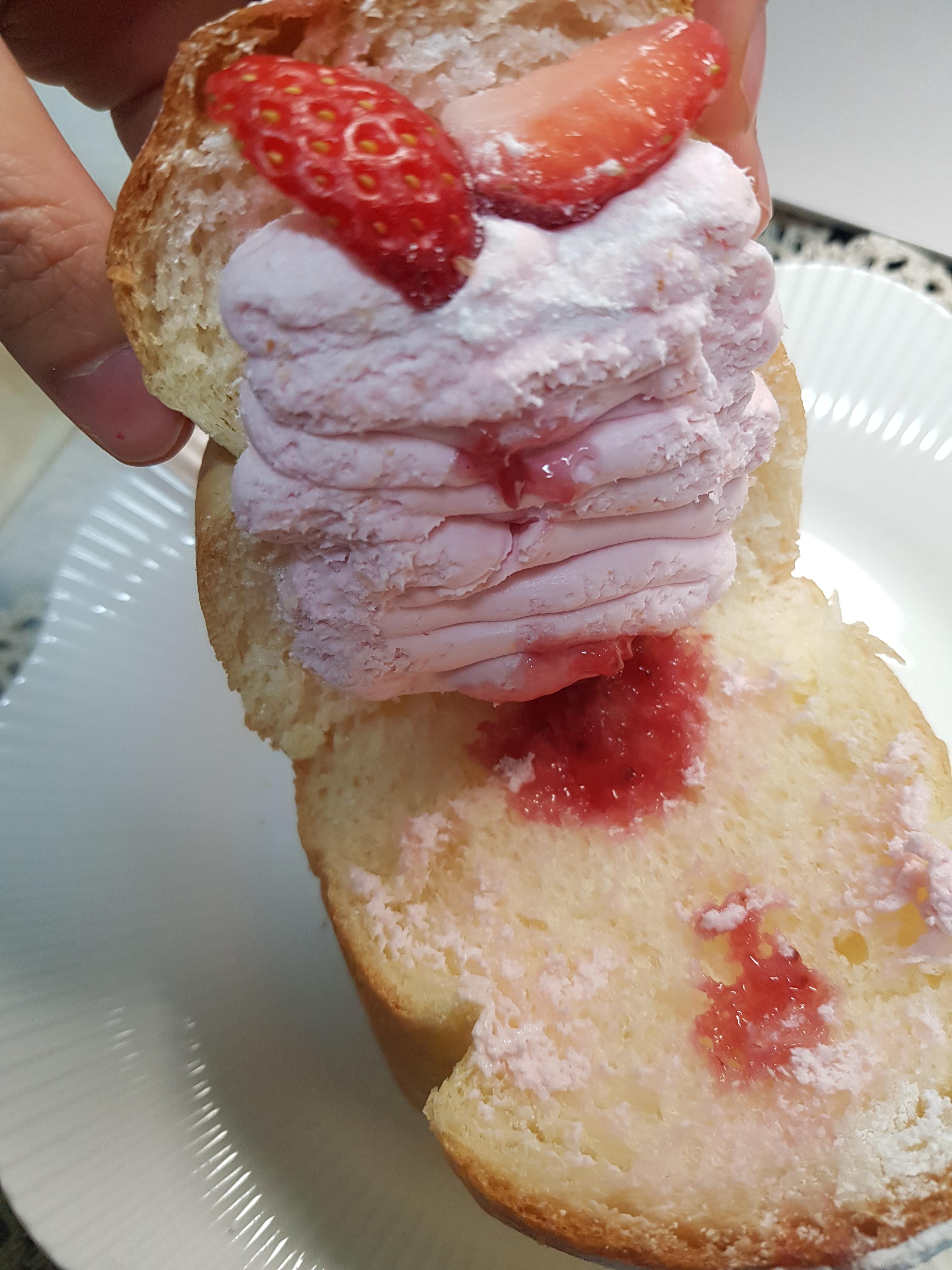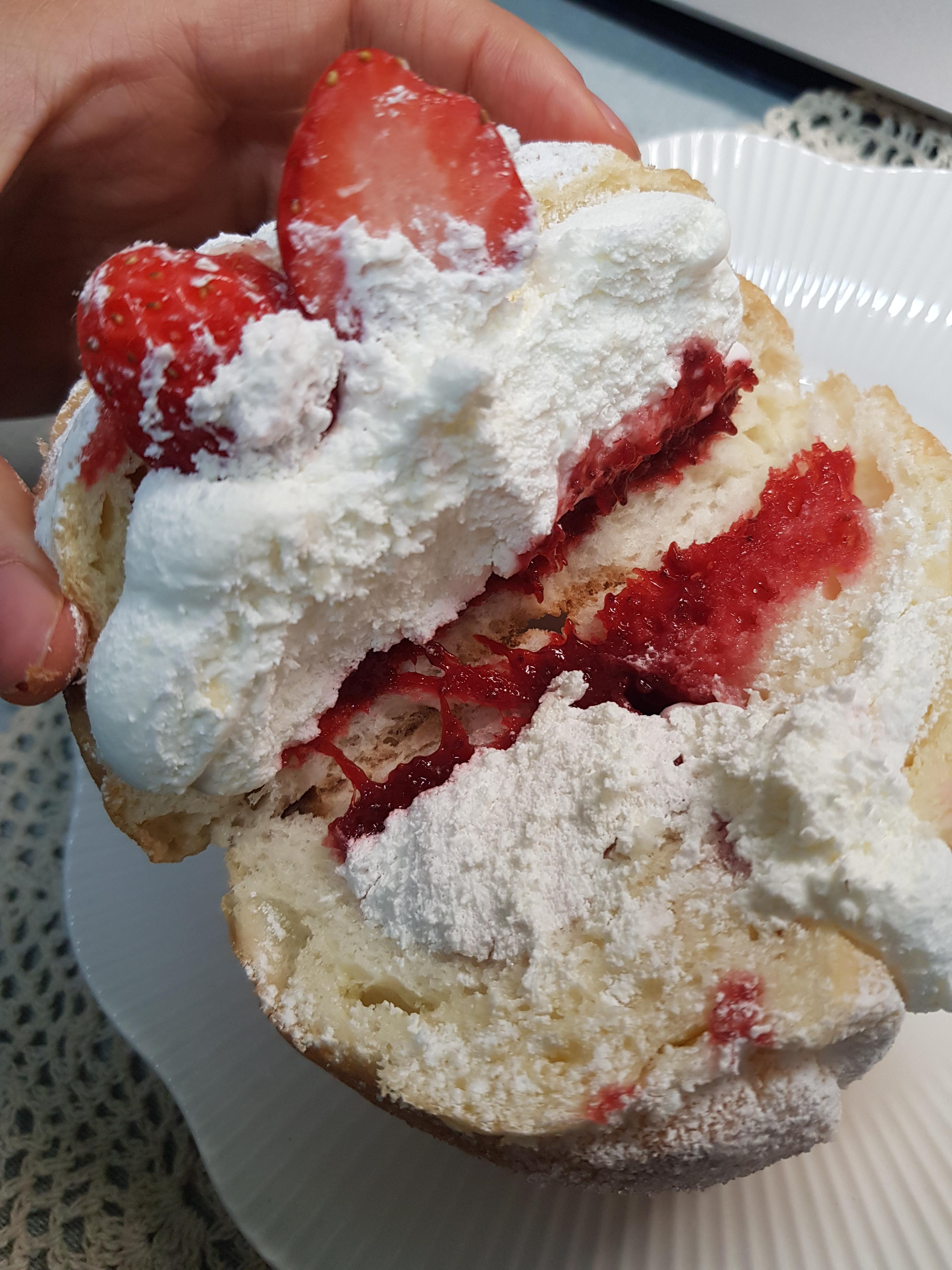 크림이 촘촘히 들어있고, 딸기잼도 들어있다.