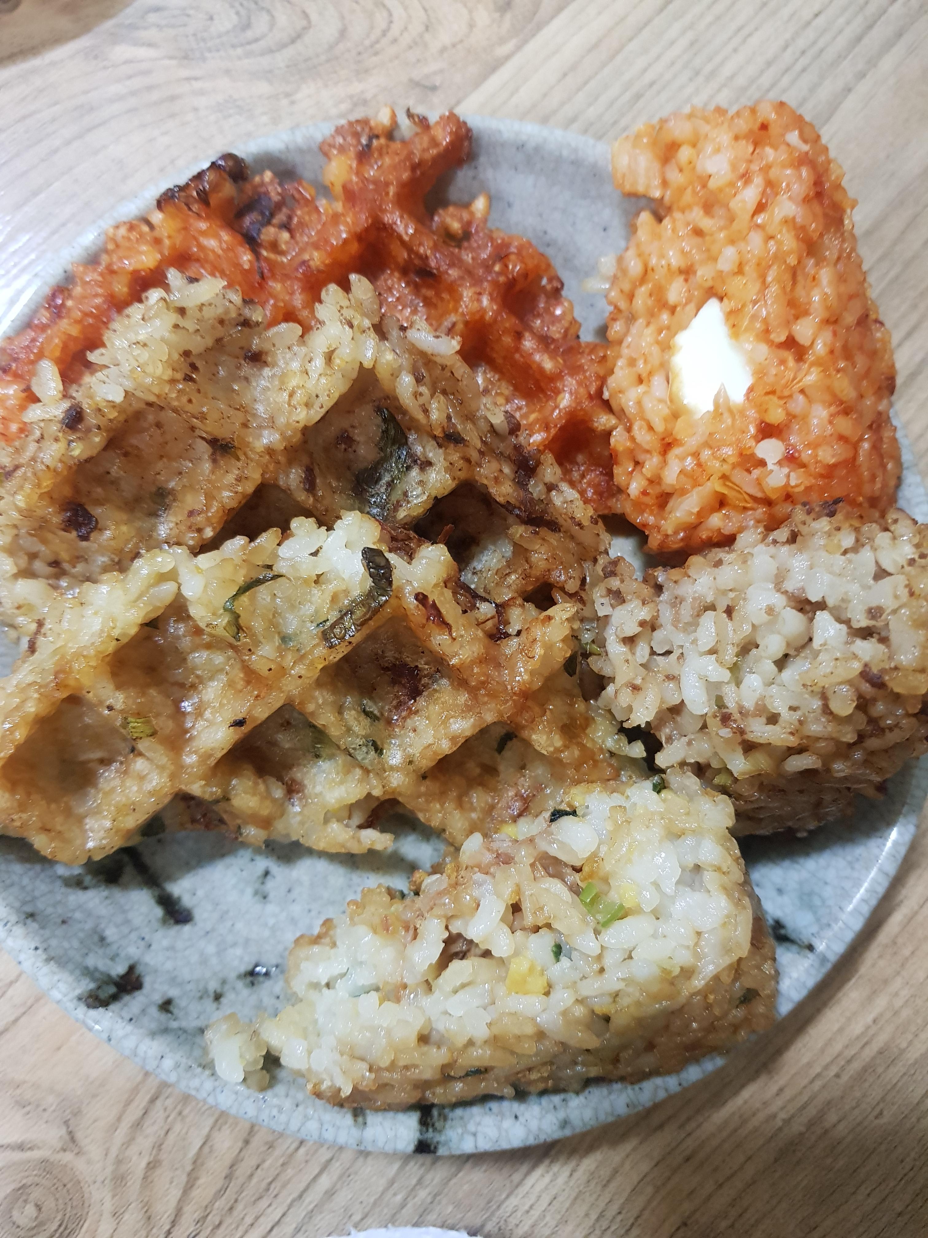 모두 약속이라도 한 것처럼 김치치즈 와플 주먹밥을 가장 먼저 먹음