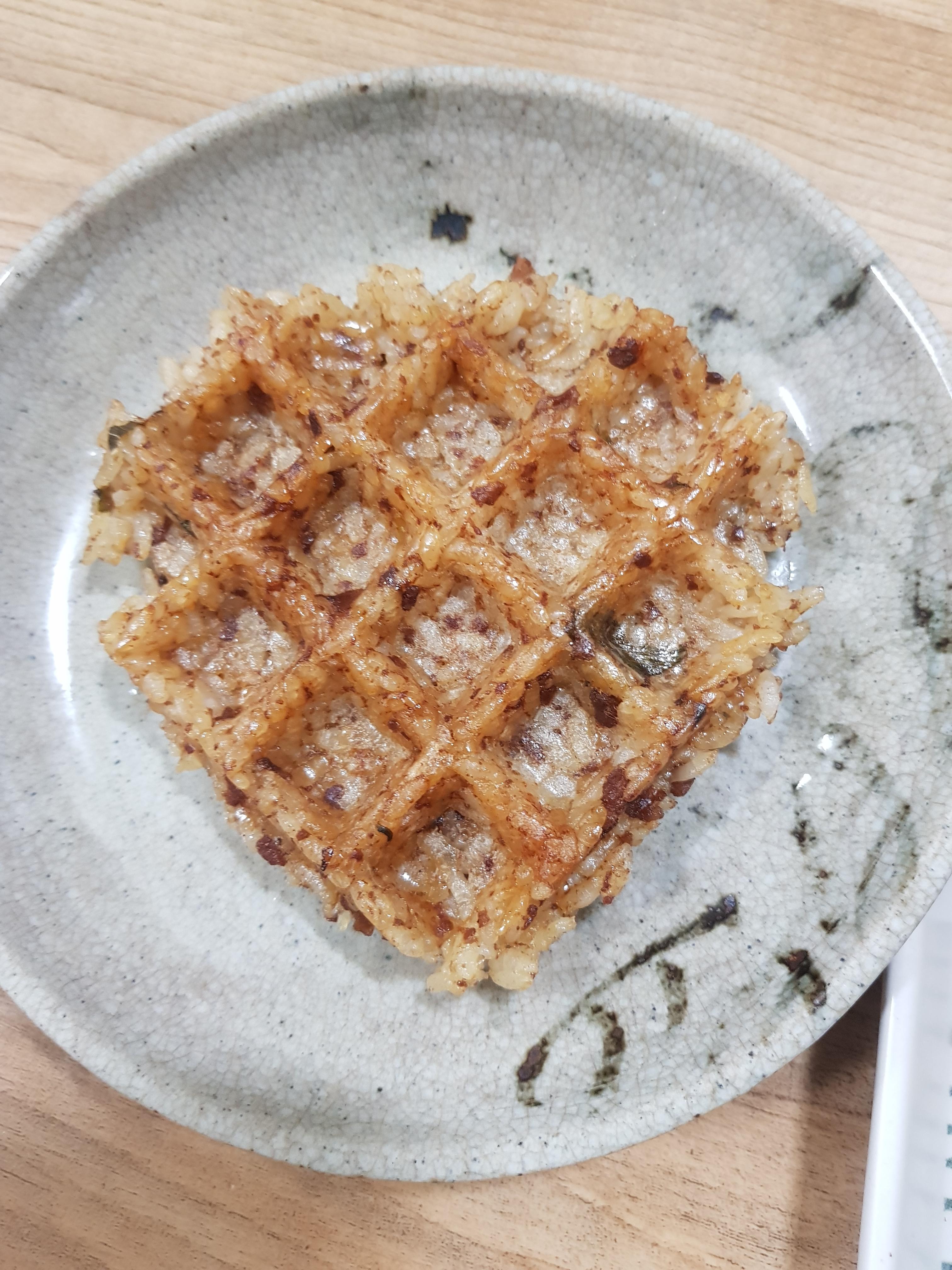 * 바삭한 누룽지 식감 원한다 >> 전자레인지 2분 30초+와플 기계 6분 이상