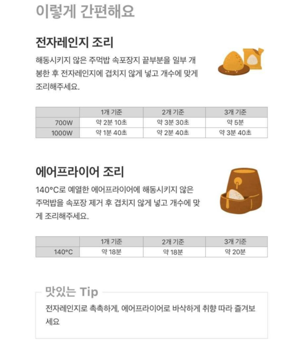 구매 페이지에 전자레인지와 에어프라이어 조리 방법이 적혀있었음