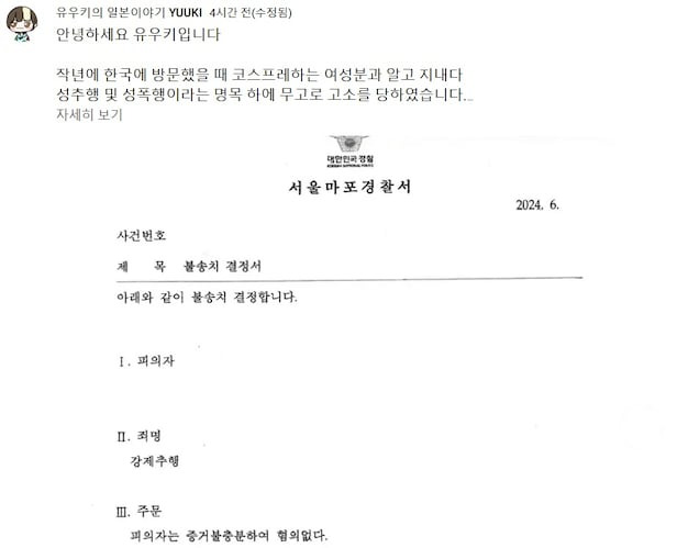 일본에서 활동하는 구독자 121만명의 한일 혼혈 유튜버 ‘유우키’가 지난해 한국 방문 중 성폭행 혐의로 무고를 당했다며 불송치 결정서를 공개했다.